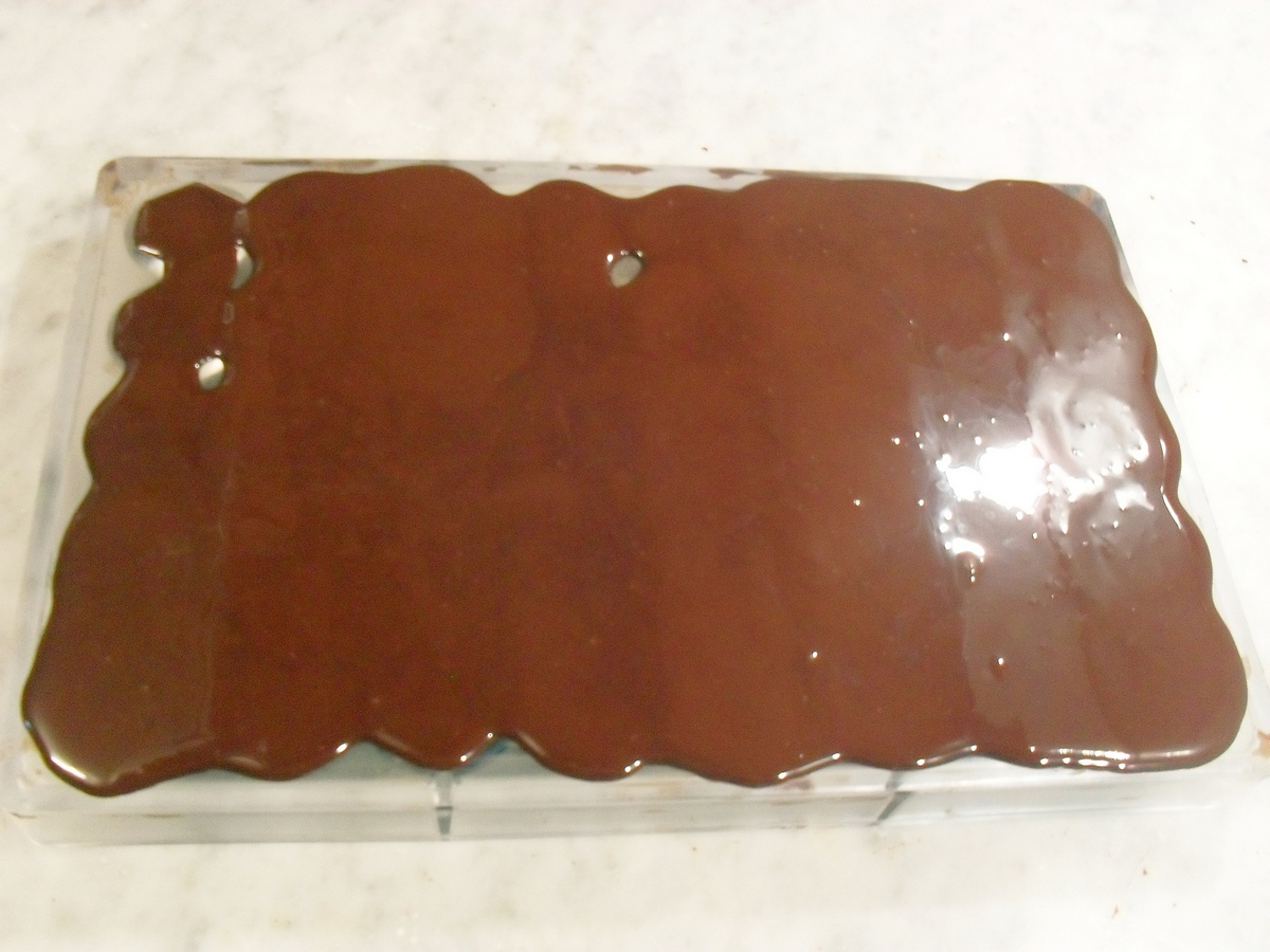 - Poi, quando la cioccolata si è un po’ seccata, si passa ancora la spatola a triangolo per rifinire eventuali piccole increspature. Lo stampo dovrà risultare pulitissimo, tranne che negli incavi dove c’è la cioccolata.