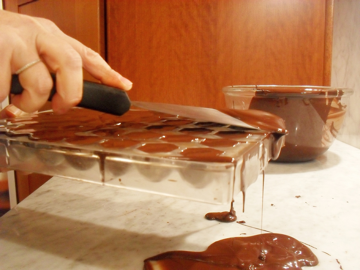 Premessa: questa operazione consiste nel far colare il cioccolato fuso e alla temperatura di 32° dentro gli stampi.